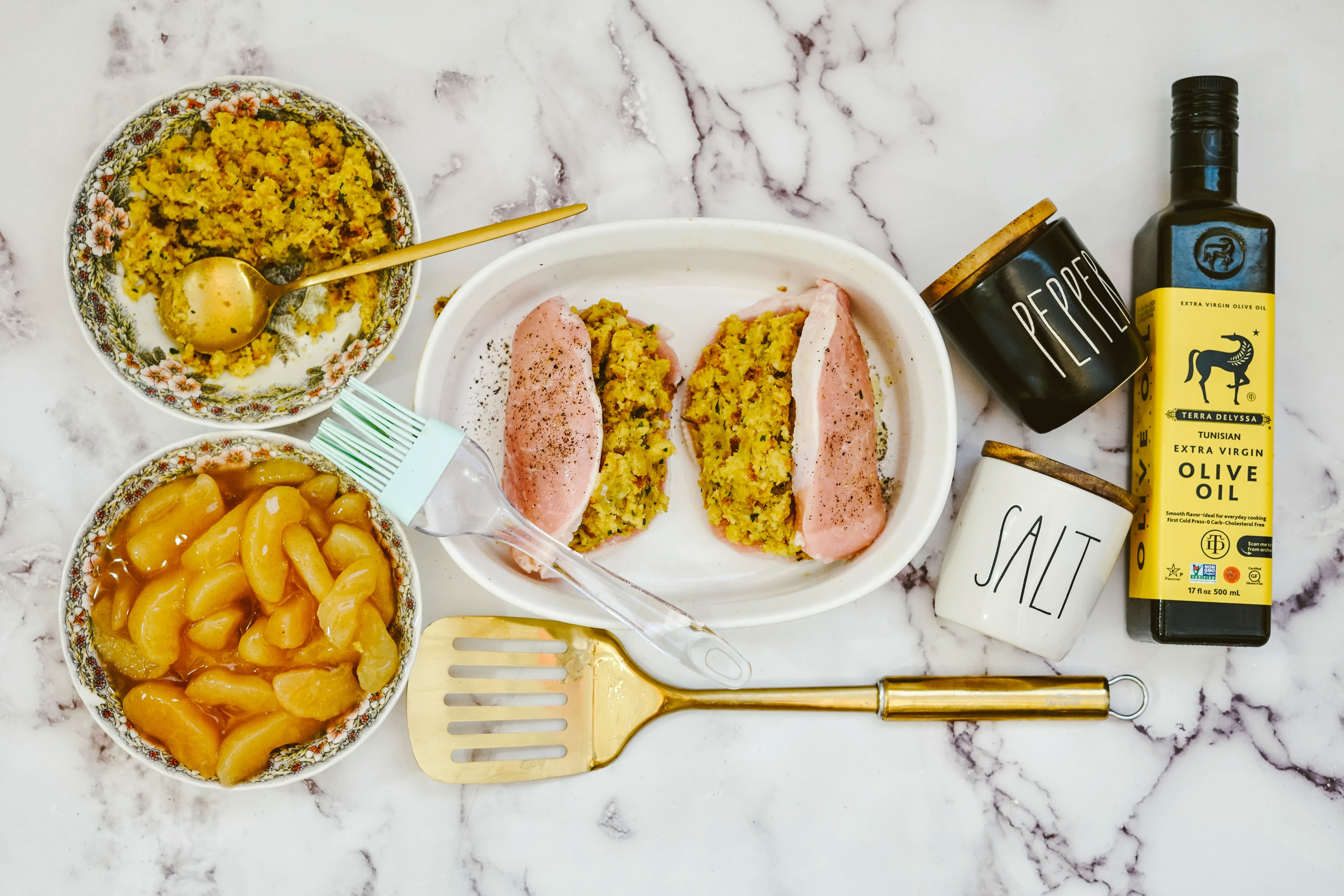 To get started, gather your ingredients. You will need thick cut pork chops, a can of apple pie filling, cooked cornbread stuffing, olive oil, salt and pepper.