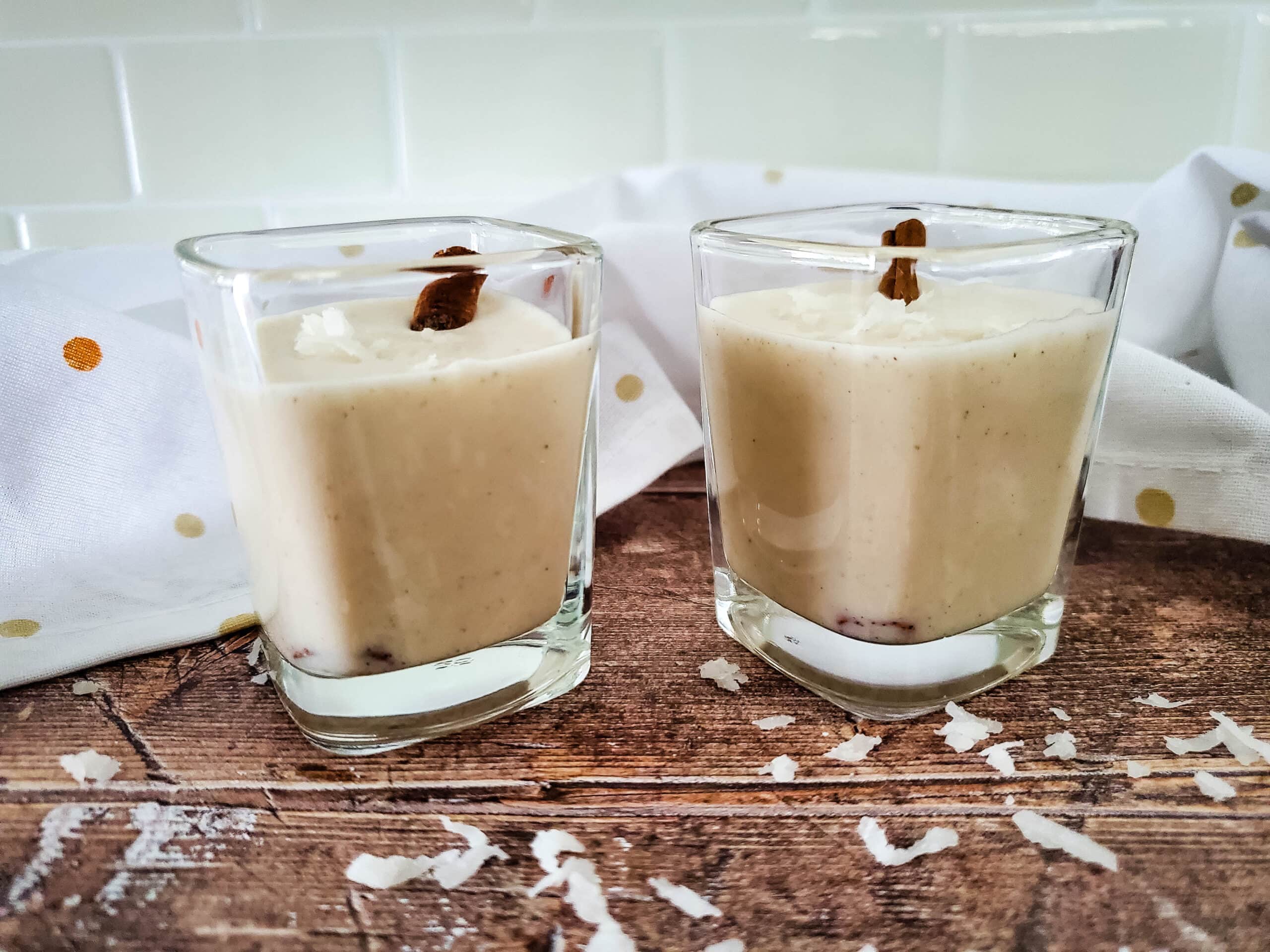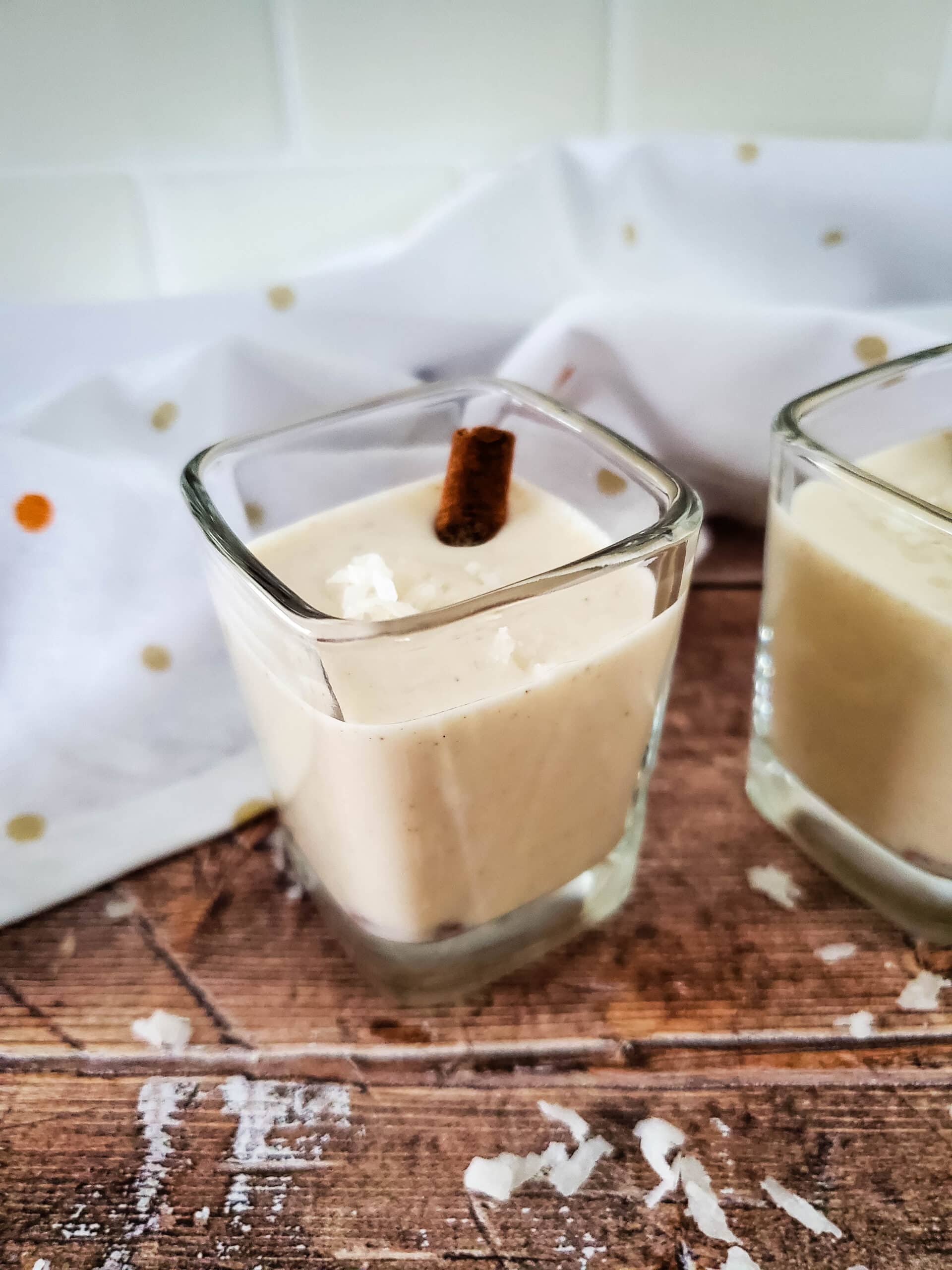 - Shake before serving. Garnish with a cinnamon stick or coconut flakes to be festive!
