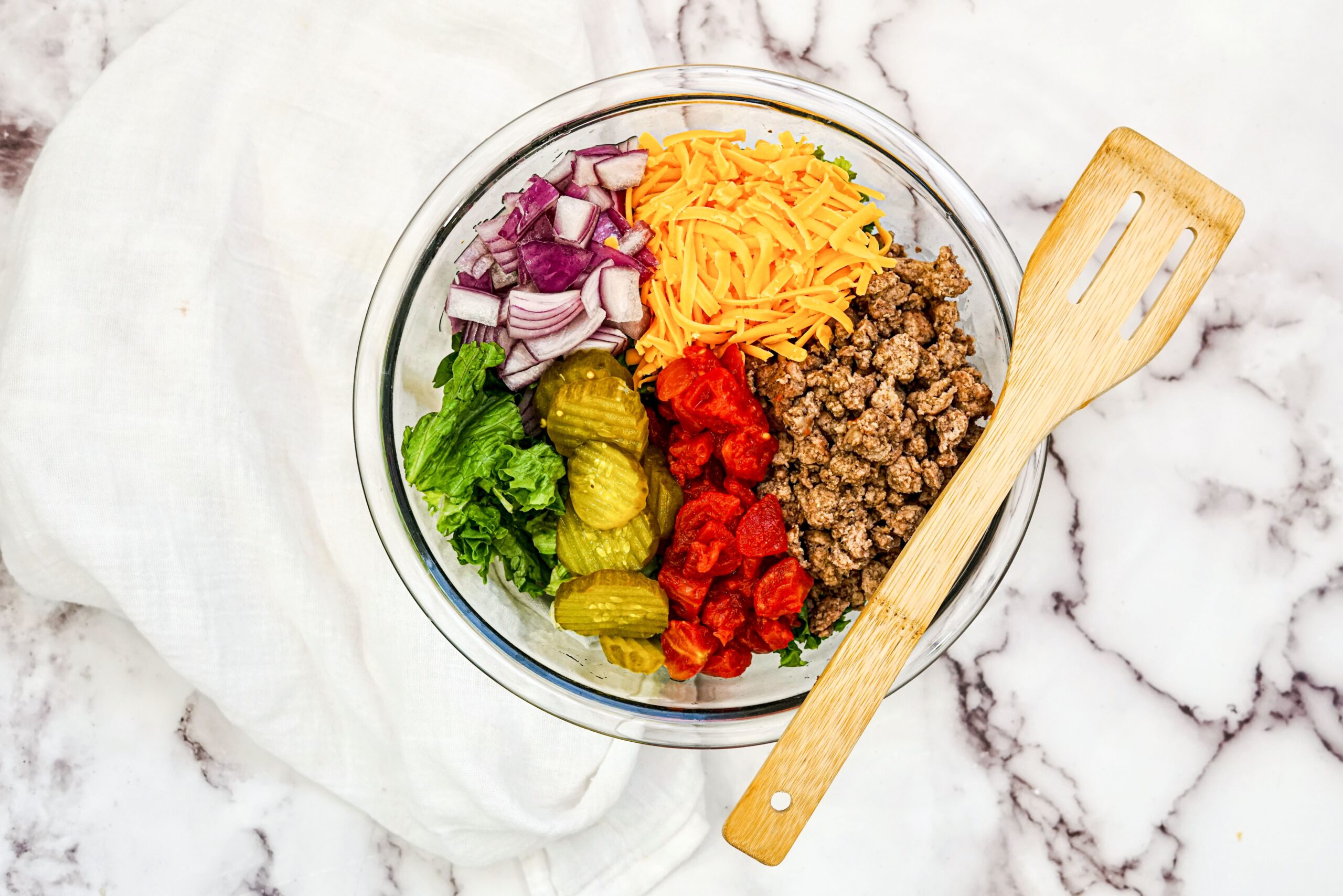 - In a large mixing bowl, combine lettuce, cheese, pickles, onions, tomatoes, & ground beef.