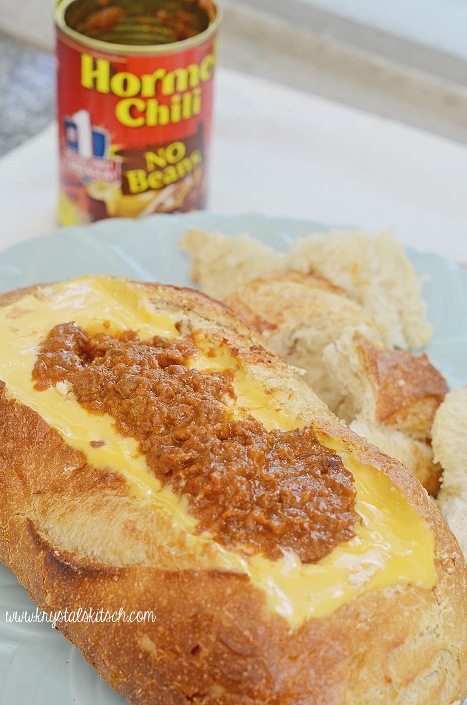 You are so going to fall in love with this simple chili cheese bread dip! It's the kind of appetizer that will wow your party guests, but it's SO fast to make. You can whip this up in a hurry with just three ingredients. All you need is a fresh loaf of bread, cheese, and chili from Hormel Foods!