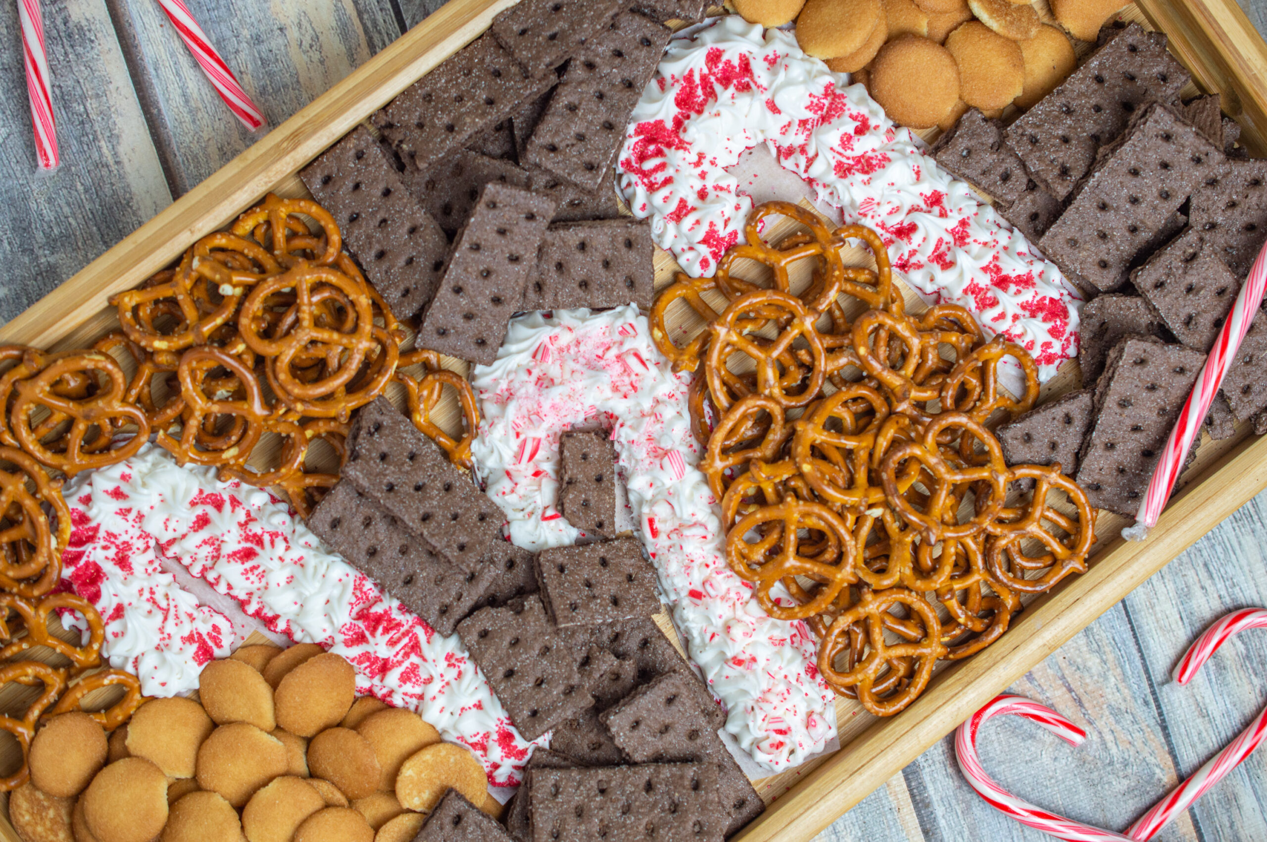 - Add snacks around to fill your board. We used Mini Nilla Wafers, mini pretzels, and chocolate graham crackers.