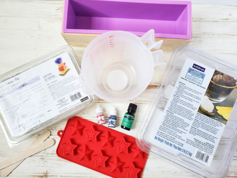 To get started, you will need Clear Glycerin Melt and Pour Soap Base, Goat’s Milk Melt and Pour Soap Base, Loaf Soap Mold with wavy soap cutter, Star candy/soap mold (I found this at Michael's but I linked a similar), Blueberry soap colorant, Cherry soap colorant, microwave-safe measuring cups with a spout, Ocean Breeze Fragrance Oil, and 4 Wooden craft sticks (for stirring).