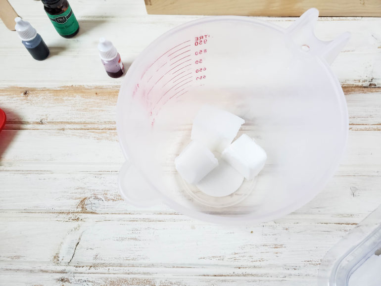 In a microwave-safe measuring cup, heat clear glycerin soap on high for 30 seconds in the microwave. Remove and stir well. If soap is not completely melted, heat for additional 10-second intervals, stirring after each heating session until fully melted.