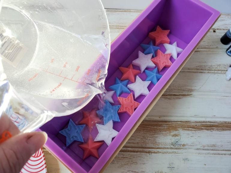 Pour the soap into the star mold. Allow to set for about 15-20 minutes until soap is completely hardened. Once soap is set, remove from mold.