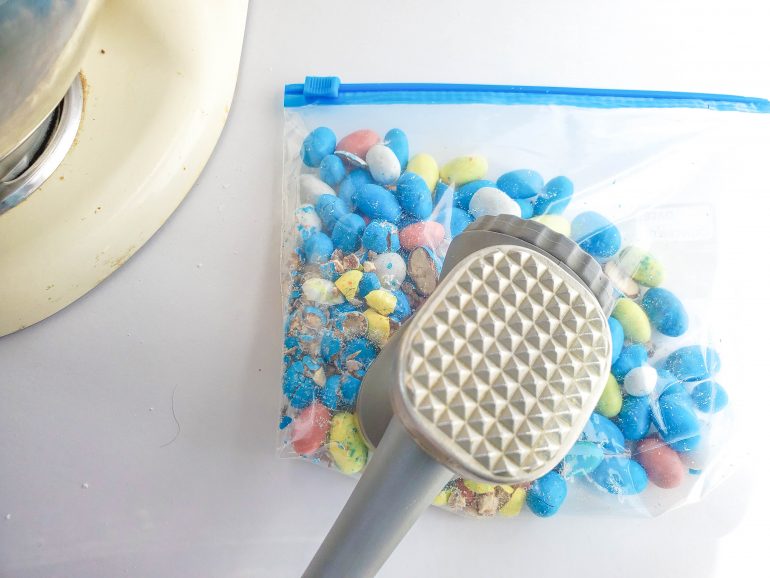 Crush the robin eggs. I do this in a plastic zipper bag with the end of a meat tenderizer, or a rolling pin. Add crushed Robin Eggs to the mixture. Stir in my hand, or beat on low, just until blended.