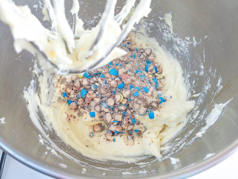 - Add crushed Robin Eggs to the mixture. Stir in my hand, or beat on low, just until blended.