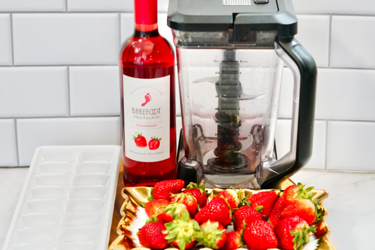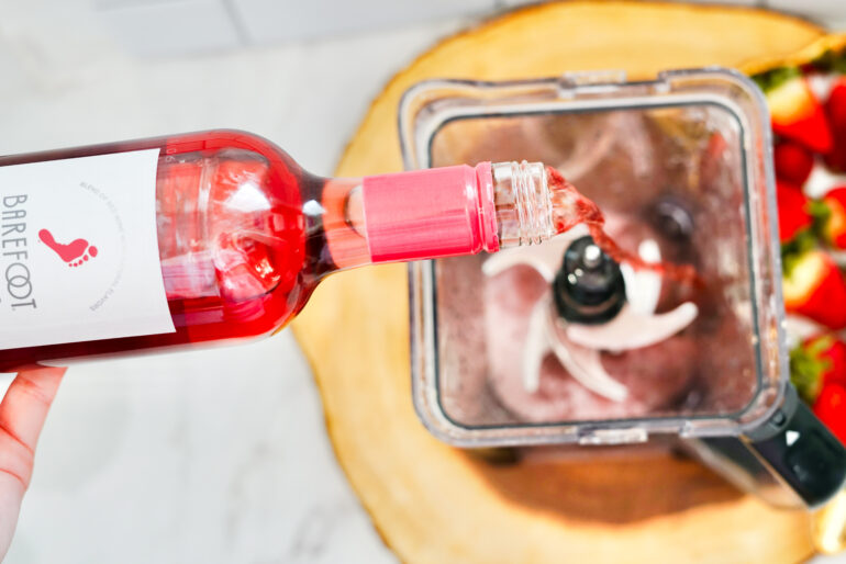 Get ready to blend it up! Pour the wine into the blender and toss in the strawberries. Fill the blender with 2 to 3 cups of ice cubes. Blend on frozen drink mode.